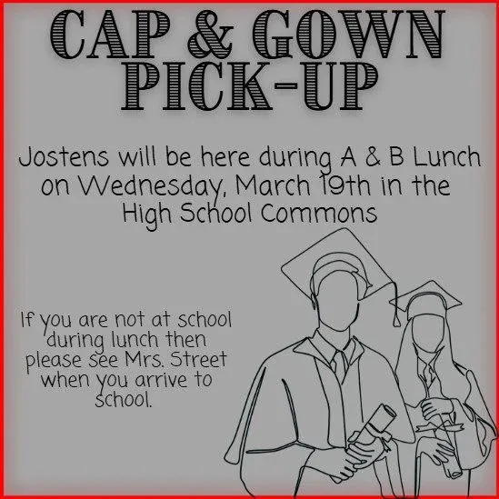 Jostens wil be here during A & B Lunch on Wednesday, March 19th in the High School Commons.If you are not at school during lunch then please see Mrs. Street when you arrive to school.